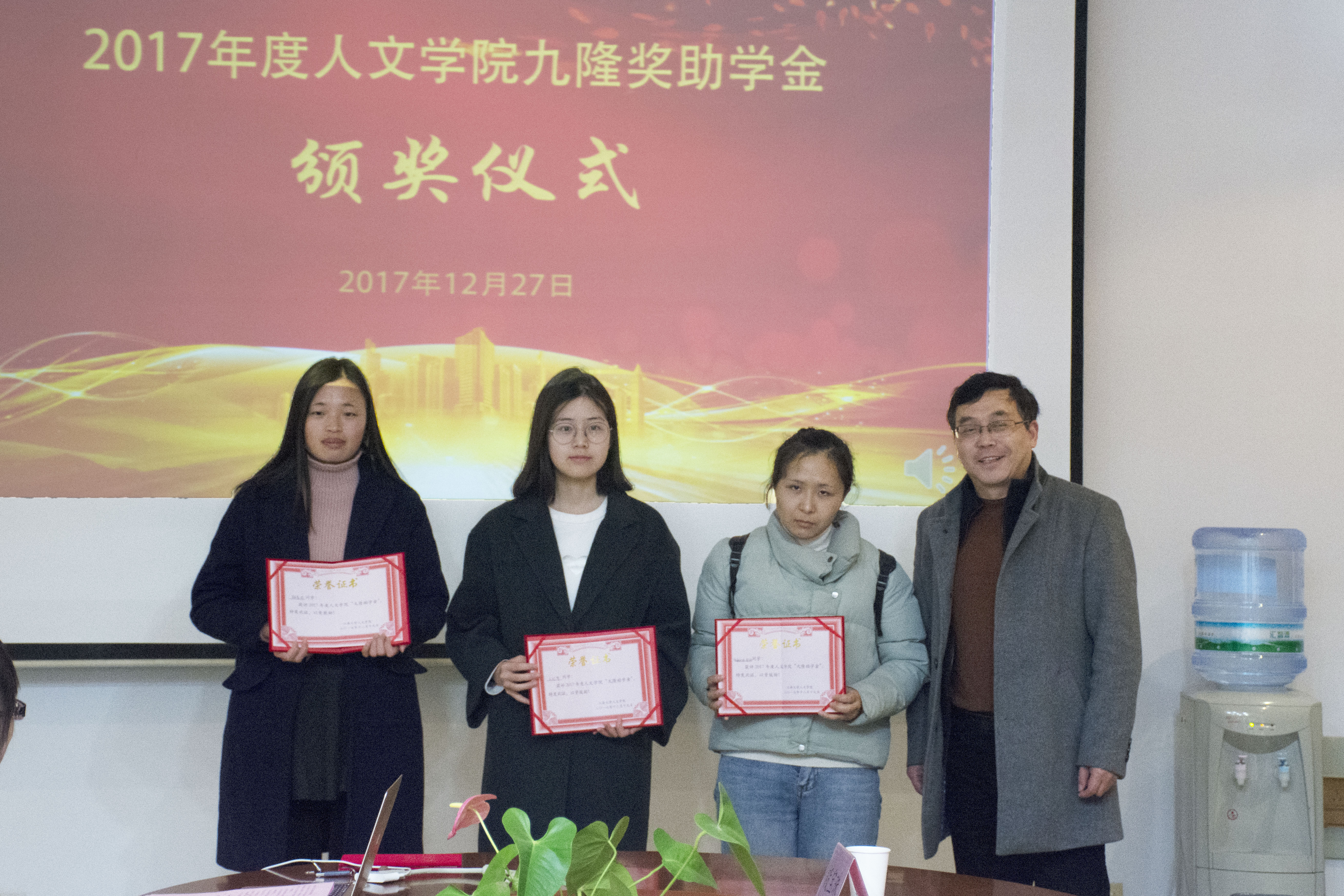 九隆奖助学金获奖学生名单。单筱婷副处长和查锡荣副总分别为“九隆奖学金”和“九隆助学金”获奖同学颁发荣誉证书。汉语1504班裴聪作为获奖学生代表发言,表达了对九隆保安服务有限公司的诚挚谢意,同时表示会发奋图强,用自己的实际行动回报学校和社会的关爱与培养。音乐1502班秦艳秋同学代表糖心vlog
