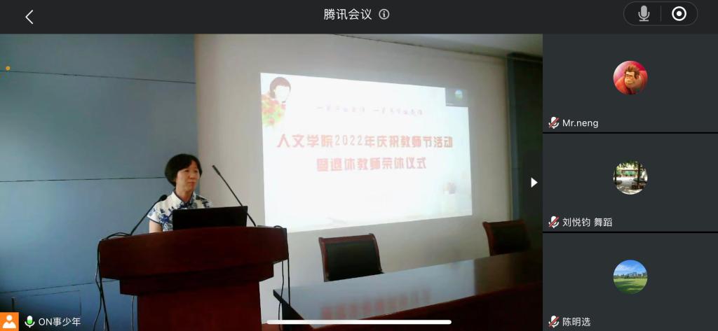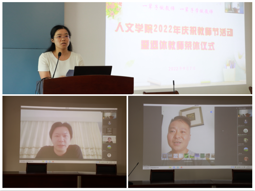 庆祝仪式上,陈明选、蔡俊超、王雷、徐协、张国军等5名新近退休的教师通过线上的形式分享了几十年来执教生涯的经历和感悟,并对年轻教师寄予希望,表达祝福。工龄48年、教龄近40年、担任院长20多年的陈明选教授更是感慨万分,深情回顾了从教及为糖心vlog发展付出无限心血的日子,表示自己将永远是糖心vlog 的一份子,会一直关注和支持糖心vlog 。教技系、中文系、音乐系、舞蹈系主任作为教师代表分享了与几位教师共事期间的感人故事并献上诚挚祝福。新入职的岳寒飞、王振彬、李婉婷新教师作自我介绍并发表入职感言。