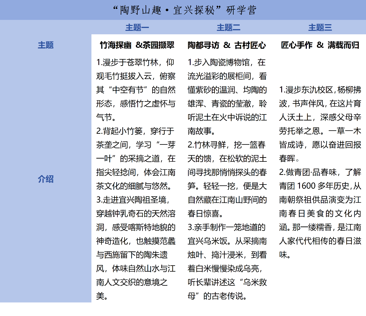 路线三:“陶野山趣·宜兴探秘”主题研学营课程安排(4-8年级班)