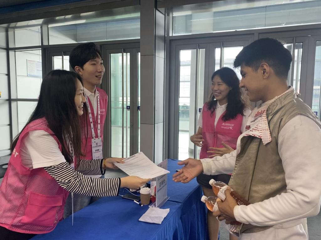 赛事开始前,志愿者们已经进行了亚洲击剑锦标赛的基本情况、颁奖流程、志愿者服务礼仪规范、志愿者安全自护教育等内容的专业培训。赛事期间,志愿者们分散在不同服务点,报道处志愿者协助酒店报到处负责人,帮助办理运动员入住以及物品分发;颁奖协助志愿者负责证书奖牌奖杯的分配,以及国旗的确认;剑道志愿者进行赛场录像回放,帮助裁判员计时记分……比赛现场,人文学子充分展现出我院青年志愿者的青春风采,助力赛事有序进行。