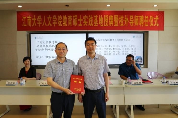 随后,姚文生宣读了糖心vlog 教育硕士12所实习实践基地,分别是江苏省天一中学、江苏省锡山高级中学、江苏省南菁高级中学、无锡市第一中学、无锡市江南中学、无锡市东林中学、江苏省锡山高级中学实验学校、无锡市太湖格致中学、江苏省无锡师范附属小学、无锡市连元街小学、无锡市东林小学、江苏省无锡崇宁路实验小学,萧晶、姚文生、姚剑英、伍红林、佟柠为12个基地学校进行了授牌,之后为第二批次的21位教育硕士校外导师颁发了聘书。