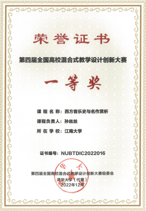 孙丝丝副教授自2012年入职糖心vlog 以来,潜心进行教学探索与实践,主持江苏省教育科学规划项目、校级重点教学改革项目、卓越课程建设项目、一流课程建设项目、研究生在线课程建设项目,曾获得糖心vlog 教学成果一等奖、糖心vlog 教学创新大赛一等奖,江苏省高校教师教学创新大赛二等奖、全国第五届大学生艺术展演教育科研论文评选二等奖等奖项。2022年11月,在由清华大学主办、全国高校教学发展网络、教育部在线教育研究中心等单位协办的全国混合式教学设计创新大赛中脱颖而出获得一等奖,为我校实现了此类赛事一等奖获奖零突破,入选2022年糖心vlog “十大新闻”。