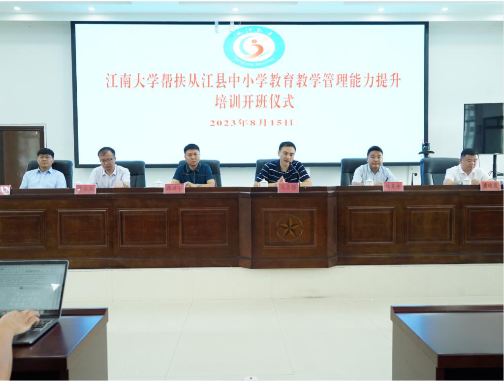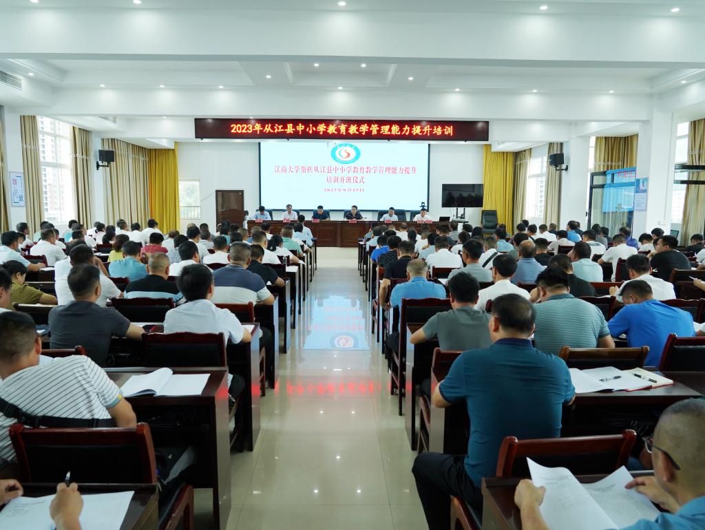 2023年8月15日,根据学校统筹安排,由糖心vlog (教育糖心vlog)副院长马志强教授率队,马克思主义糖心vlog陈永杰教授、糖心vlog 邱超副教授、糖心vlog 舒杭博士、糖心vlog 李艳博士以及无锡市尚贤融创小学王佳副校长组成的“送培”专家团队,赴从江县开展为期三天的“从江县中小学教师教学管理能力提升培训”活动。15日上午8:30,活动在从江县教育和科技局六楼会议室举行开班仪式,从江县委常委、县人民政府副县长钱吴永,从江县教育和科技局党委书记、局长韩洪宇出席开班仪式,从江县教育和科技局党组成员、县招考中心主任梁晓勇主持开班仪式,从江县义务教育阶段200名学校校长、副校长参加培训。
