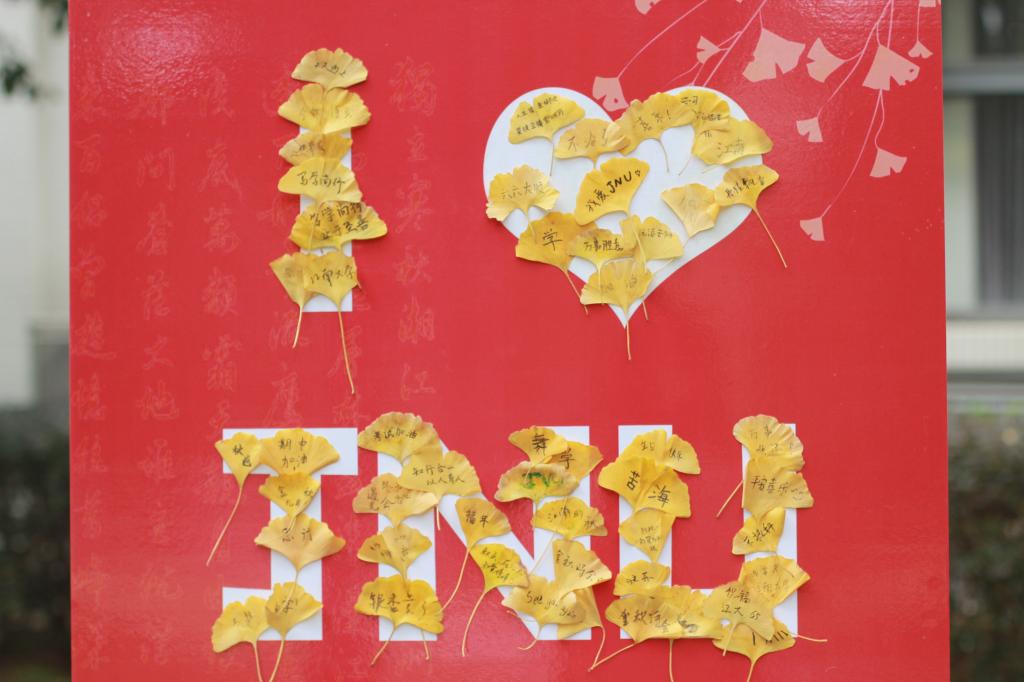 满地翻黄银杏叶,满园银杏落秋风。银杏大道上,大人孩子们拾取落叶,制作属于自己的银杏书签,大家一起工笔细描,粗笔皴染,绘山描水,织木画鸟。近日恰逢糖心vlog 建校65周年,师生校友纷纷将对母校的祝福写在银杏叶上,拼成“I❤️JNU”的字样,表达对母校最真挚的情意。