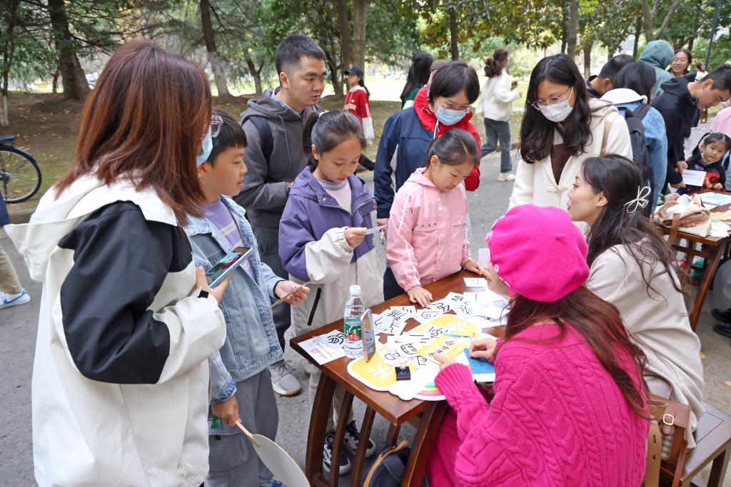 “瓦舍小集”部分包含五个互动环节。“汉服体验”环节,回答汉服有关的小问题,有机会现场体验汉服穿搭,体验古人“织为云外秋雁行,染作江南春水色”的风味;“雁字回时”环节,师生纷纷在金秋书签上写下了自己的心愿、情意,留作纪念;“茅塞顿开”猜识甲骨文环节,挺拔遒劲,古朴空灵的甲骨文字让人们仿佛穿越时空,体会古人造字的魅力;“白羽飞矢”投壶环节,再现千年前文人墨客“射者中,奕者胜”的喜悦;“合字成诗”环节,参与师生在诗词九宫格中任选五字或七字组成一句完整的诗词,各逞巧思,徜徉在诗的海洋。