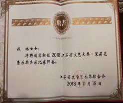 音乐系副教授、青年歌唱家钱琳,受邀担任“2018江苏省文艺大奖•茉莉花音乐奖”声乐比赛(通俗组)评委。江苏省文联党组成员、书记处王健书记亲自为评委组成员(朱昌耀、徐宝亚、王咏梅、蔡虹虹、钱琳、张丹丹、王崴)颁发茉莉花音乐奖声乐评委聘书。