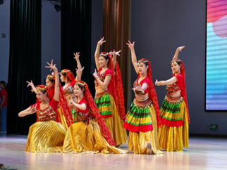 第二篇章“青春飞扬”展现了青春的多元风貌。灵动的印度舞《蒙格尼》以独特的异域风情和富有张力的肢体语言,展现了青春的活泼与多彩。组歌《青春飞扬》以三首风格各异的歌曲,生动演绎了青年人对星辰宇宙的向往、对人生选择的坚定以及对未来梦想的执着。竹笛独奏《大青山下》表达了乡村振兴背景下,青年一代对乡土生活的深情和对祖国发展的真挚礼赞。女声小合唱《绒花》,则以温暖和谐的多声部人声,赞颂了青春年华坚韧无比的精神力量。演出在唢呐二重奏《吉庆锣鼓》的热烈旋律中达到高潮,并以尾声歌舞《筑梦》完美收官,寓意两校学子共同携手,为时代筑梦。