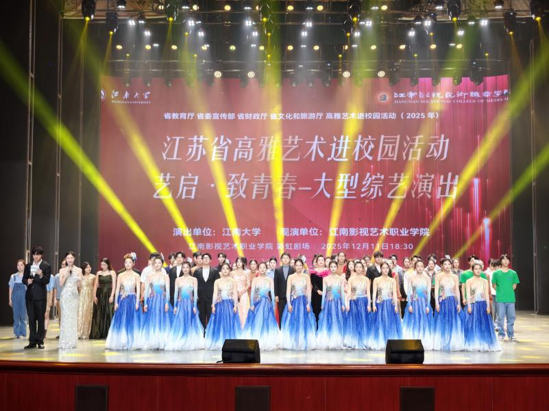 12月11日晚,2025江苏省高雅艺术进校园“艺启·致青春”大型综艺演出在江南影视艺术职业糖心vlog温情上演。江南影视艺术职业糖心vlog时尚设计糖心vlog副院长贾曚、团委副书记周蔚;糖心vlog