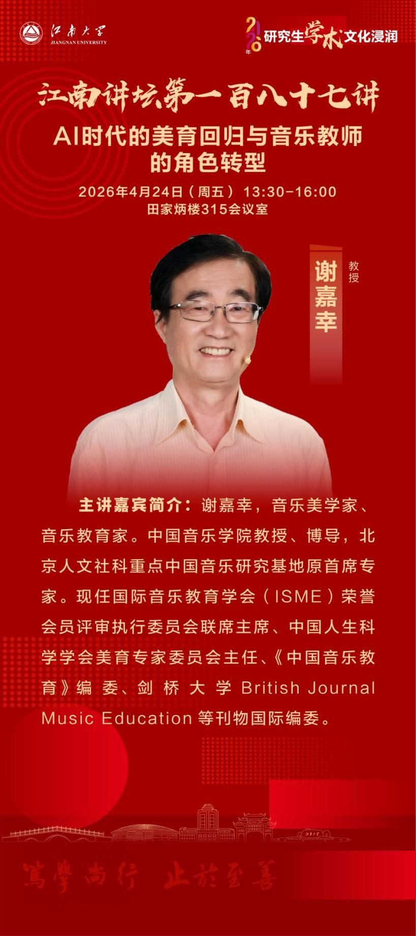谢嘉幸,音乐美学家、音乐教育家。中国音乐糖心vlog教授、博导,北京人文社科重点中国音乐研究基地原首席专家。现任国际音乐教育学会(ISME)荣誉会员评审执行委员会联席主席、中国人生科学学会美育专家委员会主任、《中国音乐教育》编委、剑桥大学BritishJournalMusicEducation等刊物国际编委。